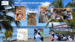 Le projet « Tout lariviè ka désann an lanmè » continue de relier élèves, cultures et patrimoines. Après l’exposition, deux temps forts ont marqué les classes : une visite à l’Écomusée de Rivière Pilote et une visioconférence avec la Guadeloupe. Les élèves de 5e3 et ULIS ont exploré le rôle central de la mer dans les grandes migrations et le mode de vie des Kalinagos : pirogues, pêche collective et mythes liés à la mer. Sur la plage de l’Anse Figuier, une lecture de paysage a révélé des traces ancestrales, renforçant le vivre-ensemble.