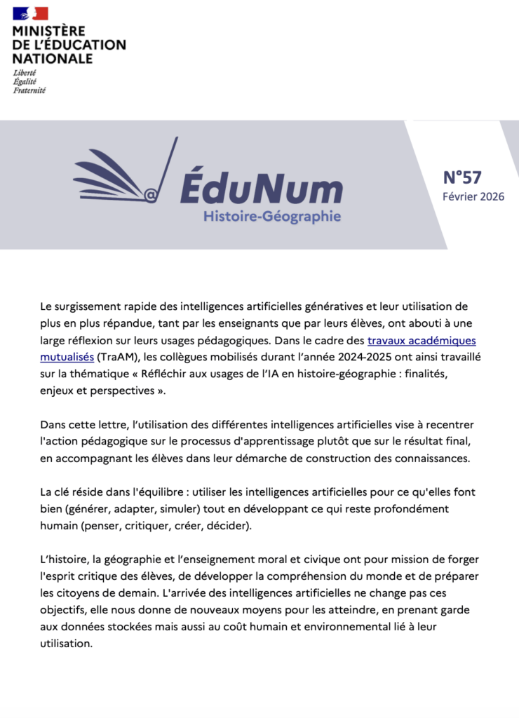 La Lettre ÉduNum Histoire-Géographie n°57 (février 2026), offre un catalogue varié d’expérimentations en classe autour de l’IA dite générative au sein des académies, support au service des apprentissages et du renforcement de l’esprit critique des élèves et levier d’innovation pédagogique et de transformation des gestes professionnels.