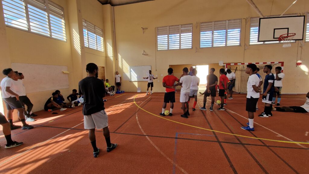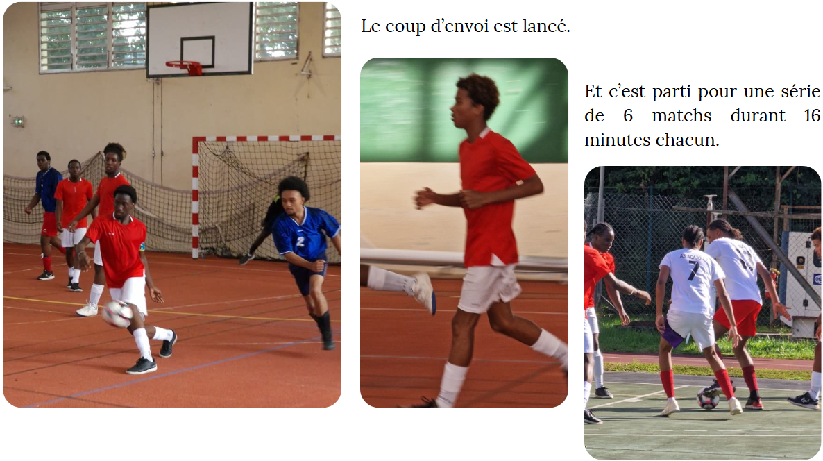 L’équipe Zobel vêtue de rouge a affronté les établissements suivants : LPO Acajou 2 en chasuble blanc, LP Bissol en chasuble orange et Lycée Montgérald en chasuble bleu.