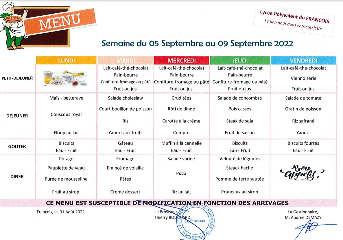 Menu du 05 au 09 septembre 2022